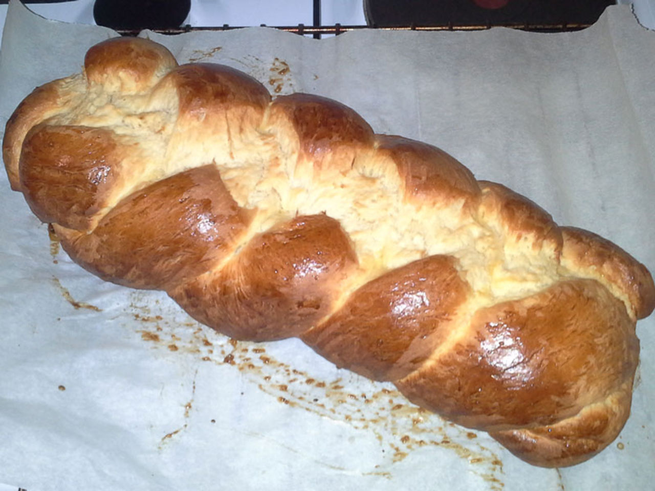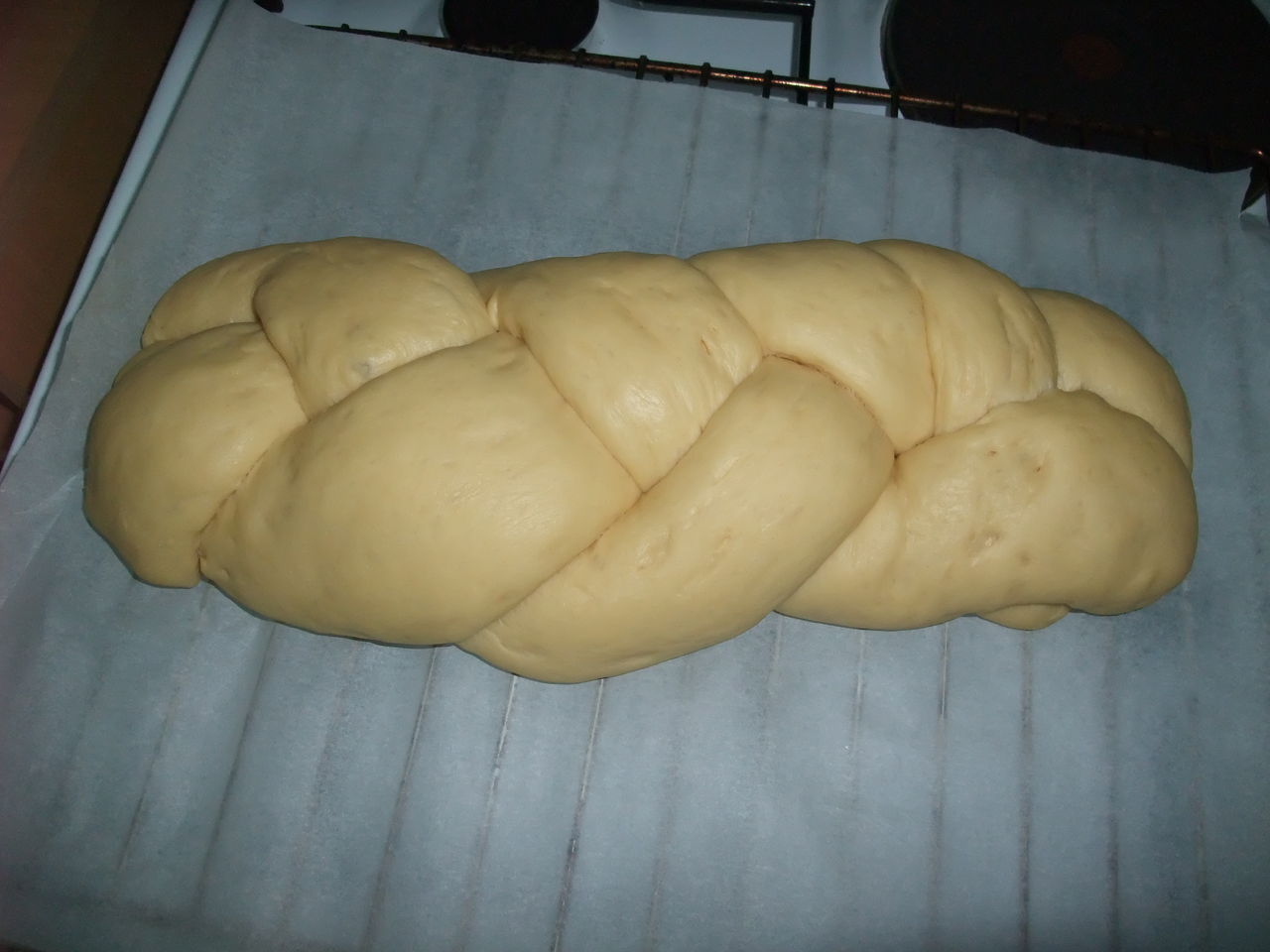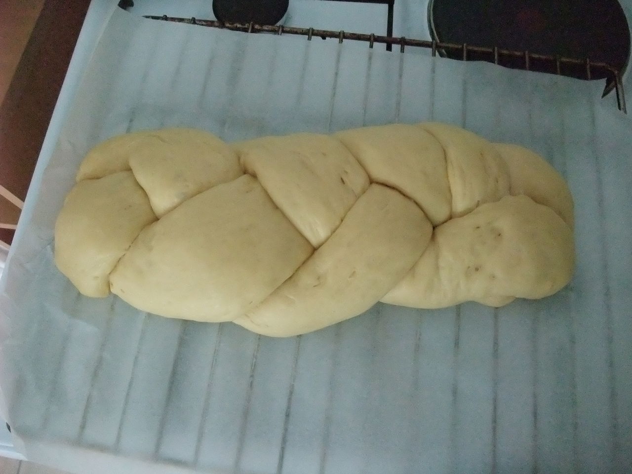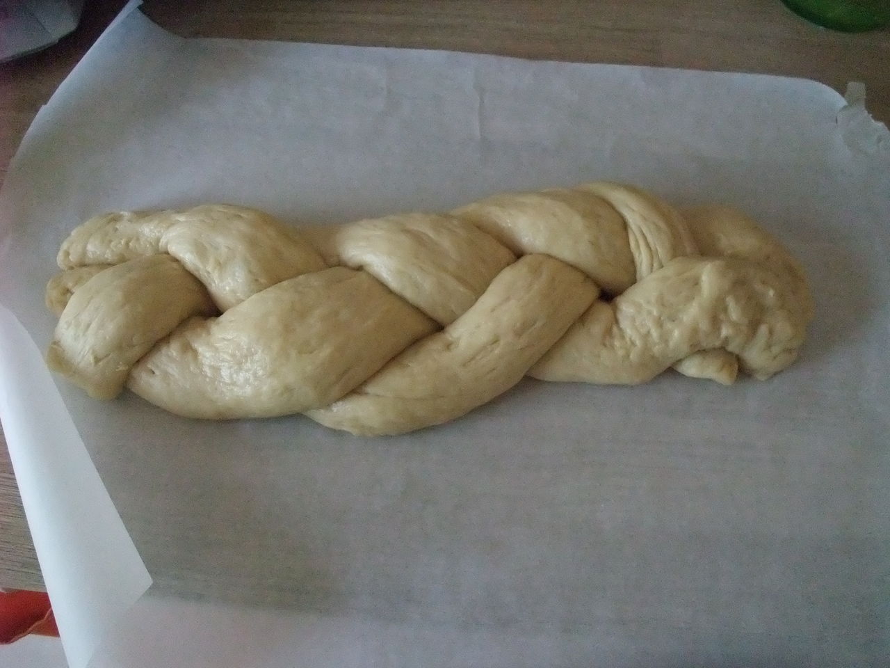 Ecraser la pâte sur le plan de travail, avec la main, pour chasser tout le gaz. La mettre en boule, que l'on divise en 3 pâtons. Façonner 3 boudins et tresser. Poser sur le papier sulfu. Laisser lever à nouveau pendant 1 heure environ en recouvrant du même torchon. (elle doit doubler de volume)